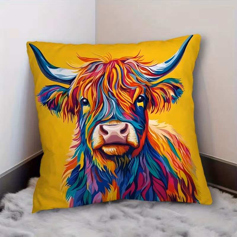 A vibrant multi-colour cow print cushion, perfect for adding personality and colour to your home.